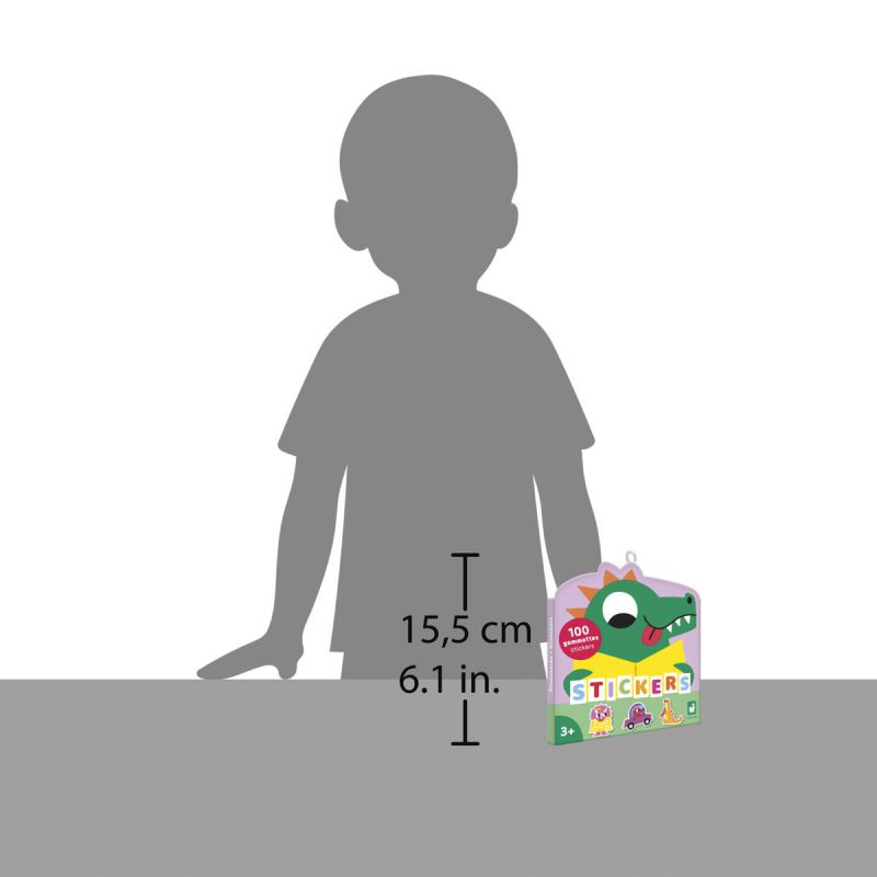 ¡Hola, dinosaurios! Este es un estuche con forma de silueta de dinosaurio que contiene 100 pegatinas reposicionables y gira en torno a unos divertidos dinosaurios: uno patina, otro está saliendo del cascarón, otro lleva sombrero Todas las pegatinas están semitroqueladas para facilitar su uso. El tamaño de las pegatinas está pensado para las manitas de los niños a partir de 3 años: miden como máximo unos 5 x 5 cm. La mitad de las pegatinas tienen el anverso amarillo. Esta actividad permite desarrollar la motricidad y la creatividad. Es ideal para niños a partir de 3 años.
