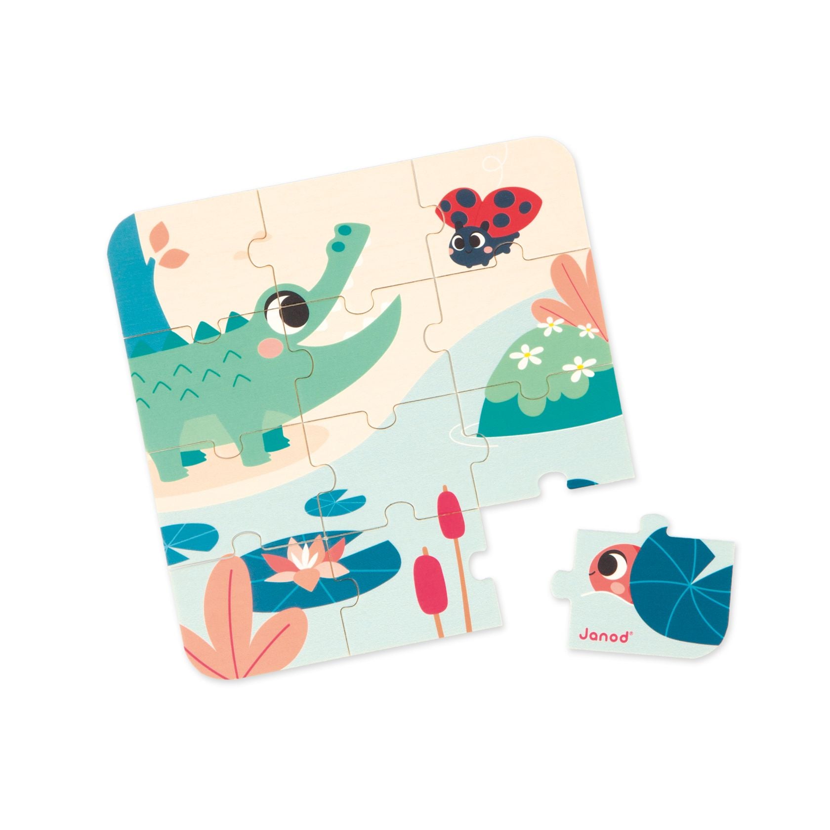 Lánzate a la aventura Janod Box, una completa caja compuesta por 4 juguetes adaptados para estimular al niño. Diseñada en colaboración con una psicomotricista, acompaña al niño progresivamente en su desarrollo psicomotriz y en sus futuros aprendizajes. El niño descubrirá un cocodrilo de equilibrio, 3 nenúfares de enroscar, 3 campanillas musicales y un puzle de madera de 12 piezas. Esos 4 juguetes de madera tienen cada uno una función diferente para estimular al pequeño. Para ayudarte a utilizar este estuche, encontrarás un detallado folleto con información sobre los principales puntos de desarrollo de un niño de 24 meses, así como explicaciones sobre los juguetes y sus objetivos pedagógicos.
