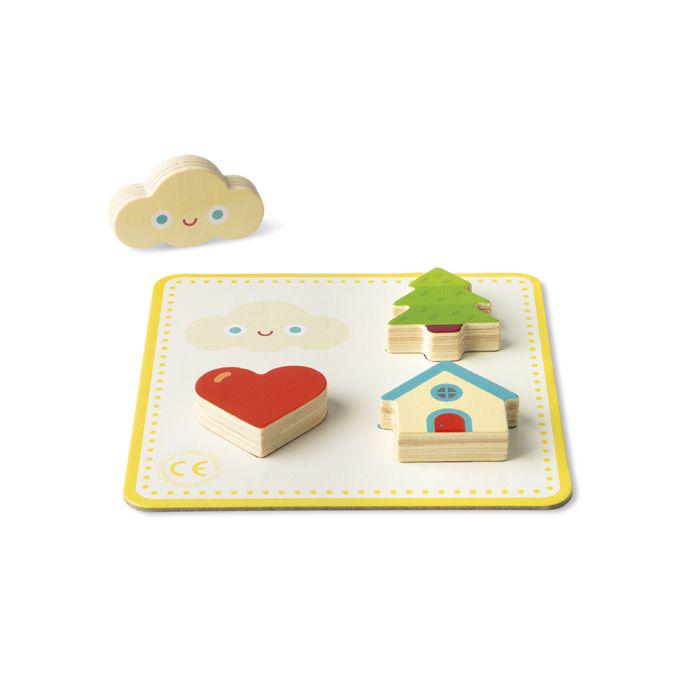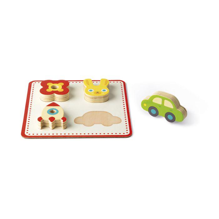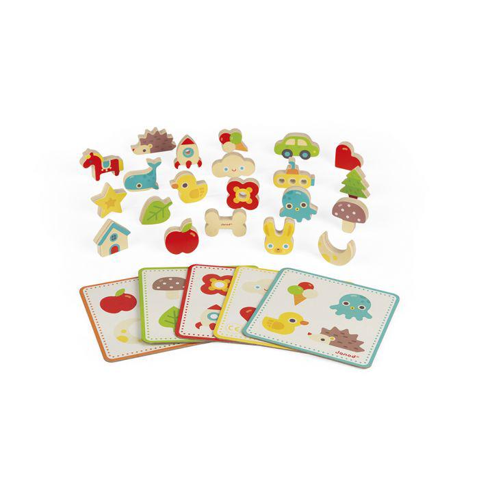De 2 a 5 jugadores. 21 piezas de madera, una bolsa de algodón y 5 cartones de juego. Mete la mano en la bolsa para ser el primero en encontrar las 4 piezas que aparecen en el cartón de juego, ¡solo vale tocar! ¡Pero cuidado con la pieza «trampa»! El que saque el hueso deberá volver a meter en la bolsa todas las piezas que ya haya ganado. Variante para los más pequeños: cada jugador también puede sacar, por turnos, una pieza de la bolsa. Si dicha pieza aparece en su cartón de juego, la coloca encima; si no, la vuelve a meter en la bolsa. Un juego ideal para desarrollar el sentido del tacto y la motricidad fina de su hijo.