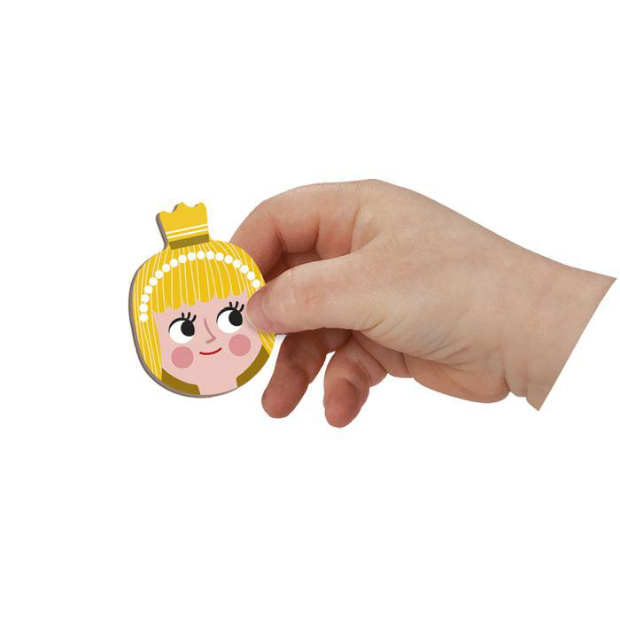 Juego educativo magnético hecho de cartón sobre el tema de los cuentos de hadas, compuesto por 30 imanes y 10 cartas. Una vez abierto el libro, el objetivo del juego es usar los imanes para recomponer en la escena magnética el personaje de cuento indicado en la carta. El niño también se podrá divertir mezclando las diferentes piezas para crear personajes estrambóticos, ya que son intercambiables.